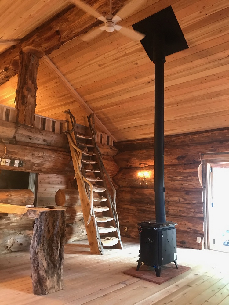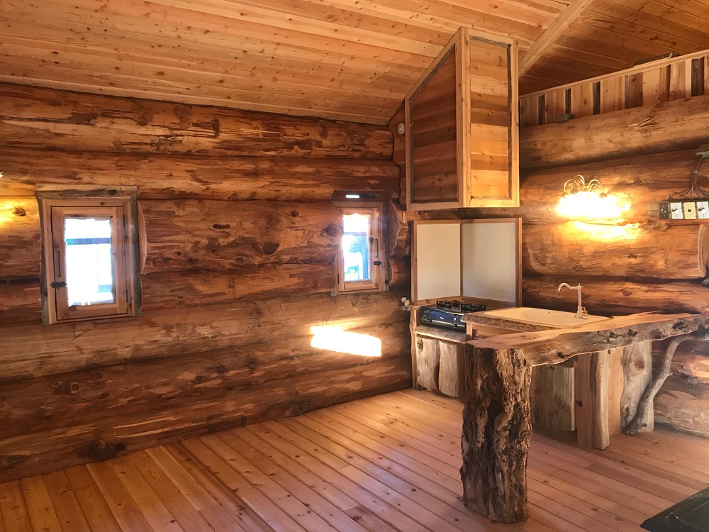 キッチンにもロフトへの階段にもゴツゴツの木をたくさん使用。木の自然な姿、様々な表情をたくさん楽しめるログハウスです。